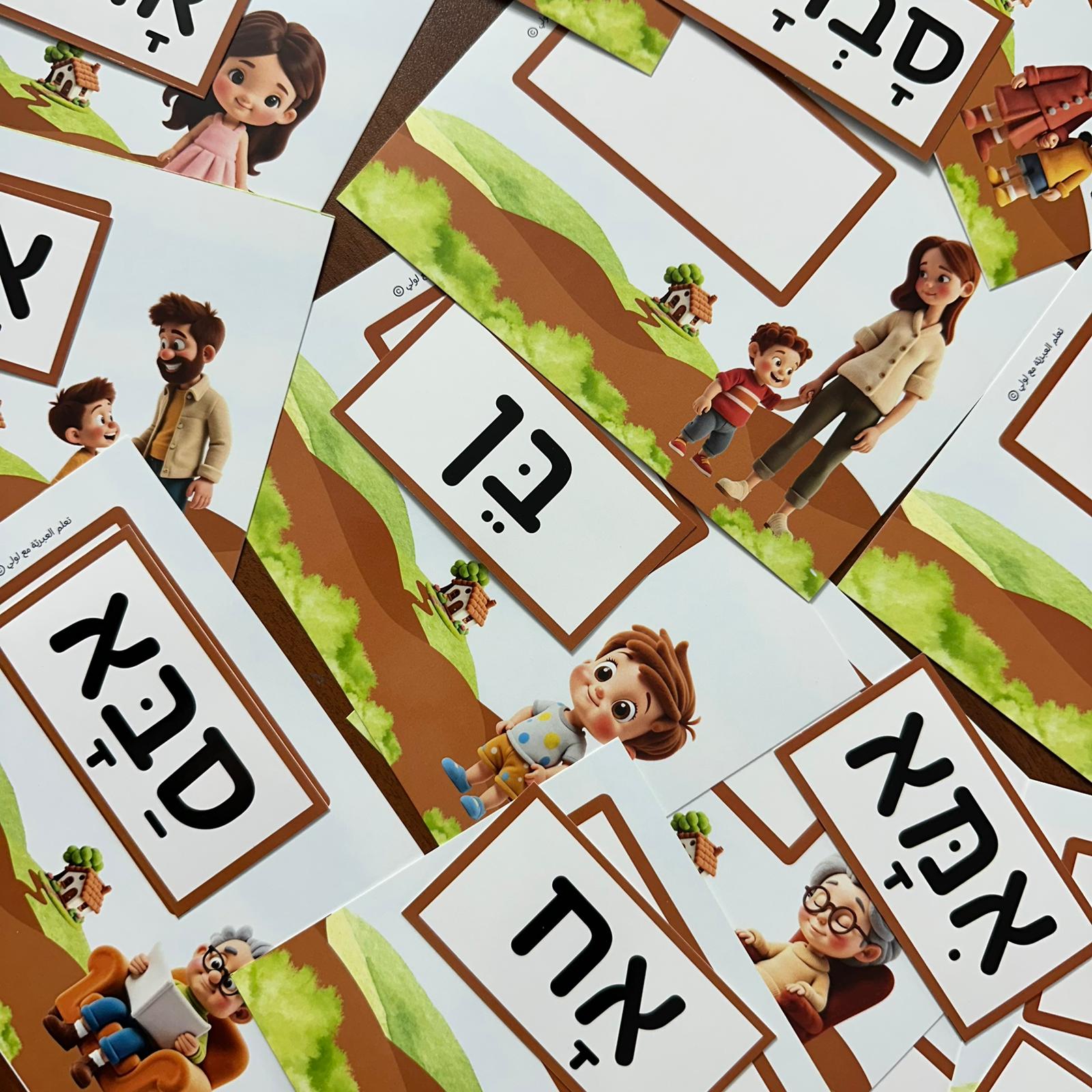 مجموعة بطاقات تعليمية مصمّمة خصيصًا لتعليم مفردات أفراد العائلة باللغة العبرية بطريقة ممتعة وبصرية، مناسبة للأطفال في المراحل الأولى من التعلّم.
